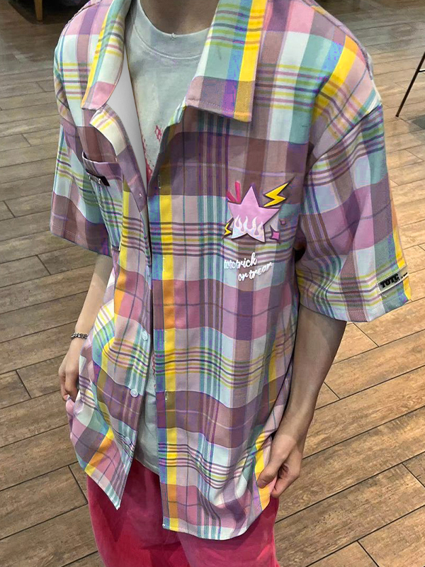 Herren Vintage-Bluse mit buntem Karomuster und kurzen Ärmeln
