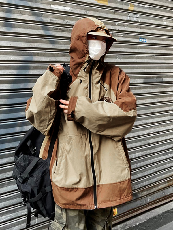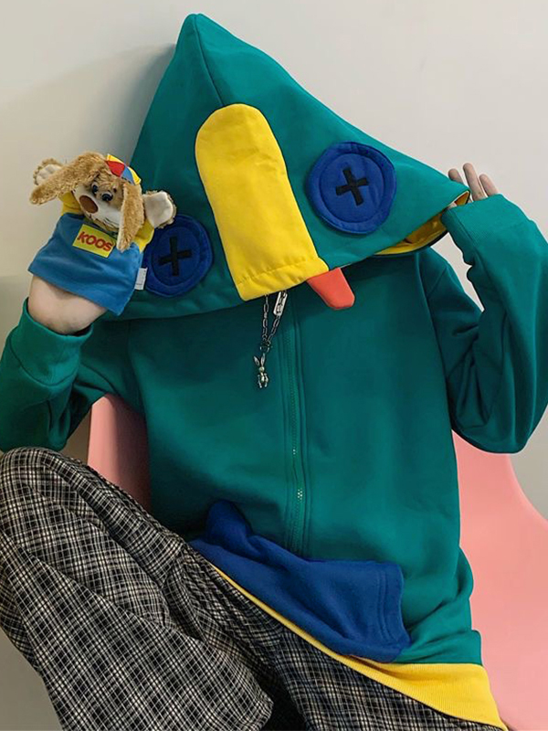 Oversize-Stickerei-Farbblock-Kapuzenjacke mit Reißverschluss