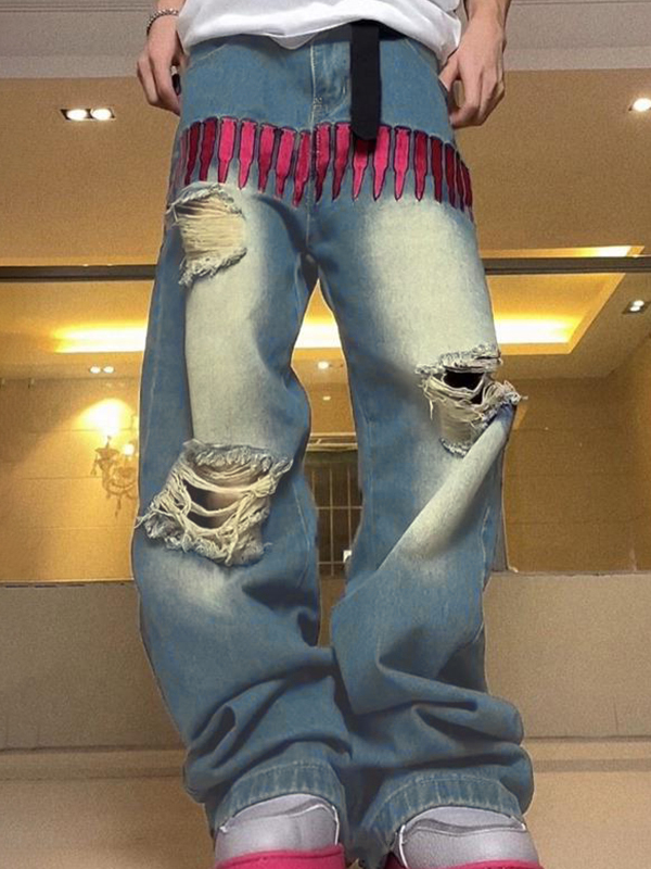 Zerrissene, lockere Herrenjeans mit Bullet-Stickerei in Rosa