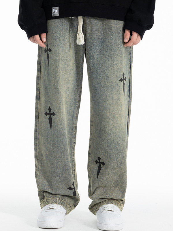 Herrenhose mit geradem Bein und Kordelzug im Distressed-Cross-Print