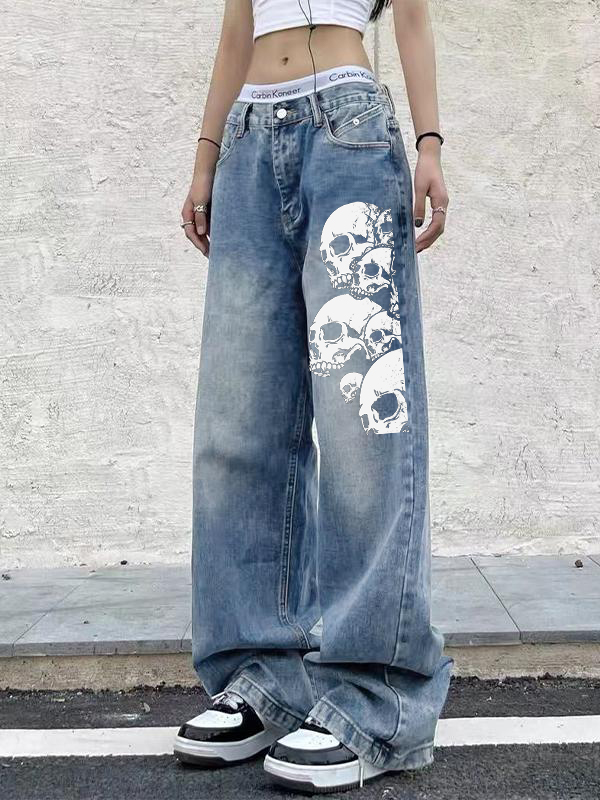 Boyfriendjeans mit weitem Bein und Totenkopf-Print im Vintage-Stil in Blau