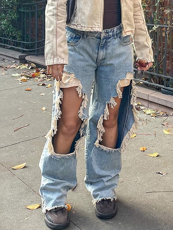 Ein großes Loch in der zerrissenen Jeans am Knie